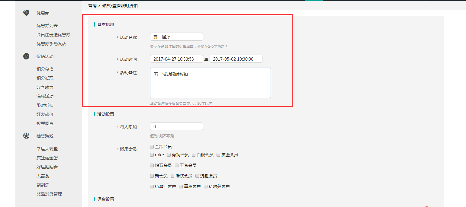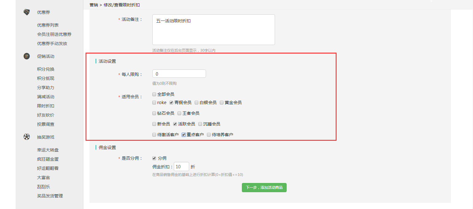 ③ 填寫活動(dòng)設(shè)置。首先選擇每人限購數(shù),系統(tǒng)默認(rèn)為0(0代表不做限制),商家可以根據(jù)實(shí)際情況設(shè)置購買限制,如每人限購1件商品,第二步選擇活動(dòng)范圍,具體參與會(huì)員范圍需要商家自己考慮,在方框中進(jìn)行勾選。