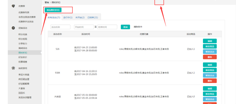 ① 進(jìn)入“營(yíng)銷”欄目下的“限時(shí)折扣”,點(diǎn)擊左上角“添加限時(shí)折扣”按鈕。