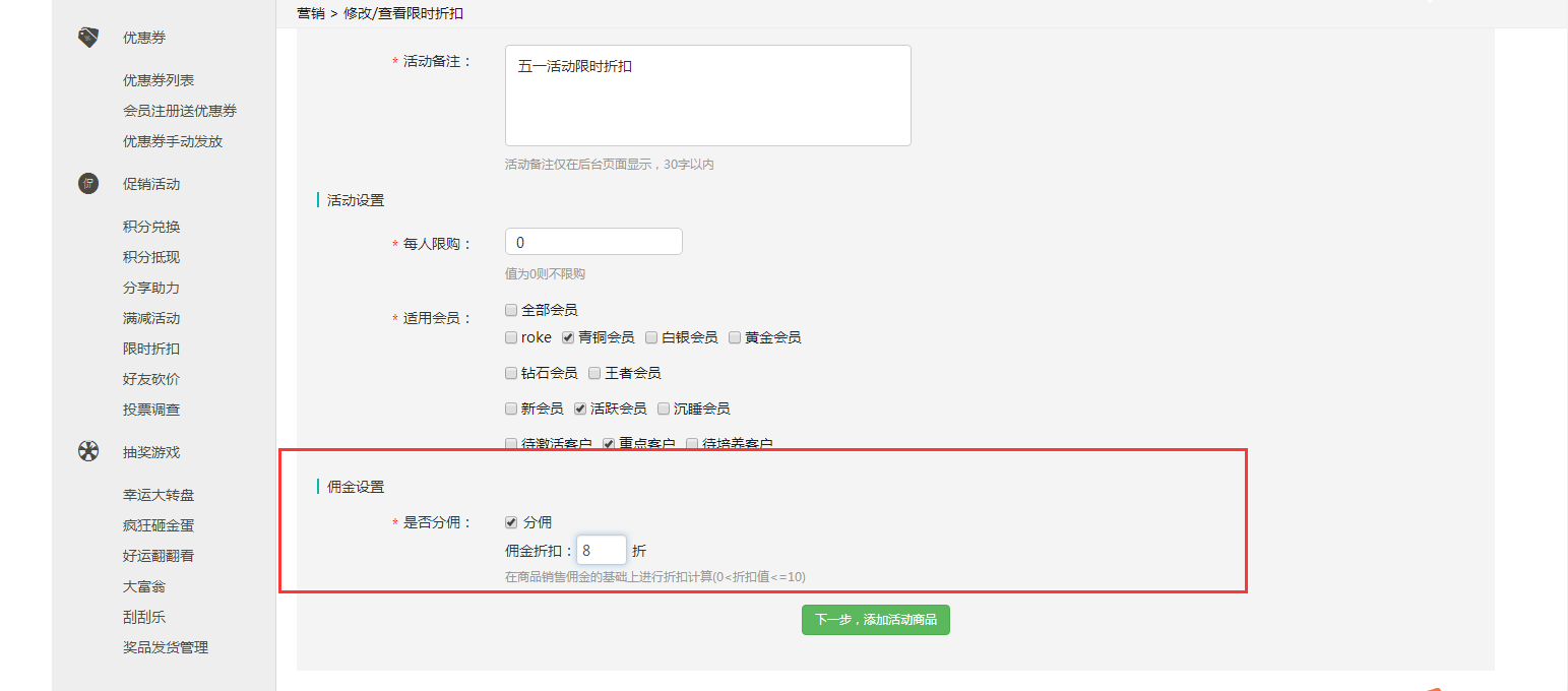 ④ 設(shè)置傭金折扣。由于商品打折,所以商家可能針對(duì)該商品不給于分銷商傭金,或者對(duì)給分銷商的傭金“打折”。首先商家需要勾選打折商品是否分傭,如果依然分傭但是想減少傭金,商家可以對(duì)于商品傭金打折,這個(gè)商家可以根據(jù)活動(dòng)折扣自行設(shè)置。設(shè)置完后勾選下一步選擇商品。