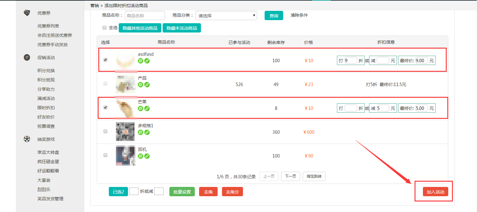 ⑤ 添加活動(dòng)商品,首先在需要填加進(jìn)活動(dòng)的商品前進(jìn)行勾選,然后設(shè)置商品折扣,這里會(huì)有兩種折扣形式,一種是打折,如10元商品,打9折,系統(tǒng)會(huì)生成最終價(jià)為9元,還有一種是減價(jià),如10元商品,減5元,系統(tǒng)會(huì)生成最終價(jià)為5元。設(shè)置完所有活動(dòng)商品的折扣后點(diǎn)擊右下角的“加入活動(dòng)”按鈕,整個(gè)限時(shí)折扣活動(dòng)就算設(shè)置成功了。