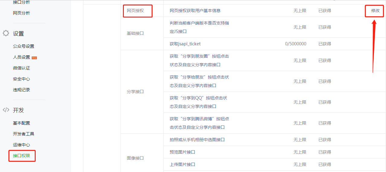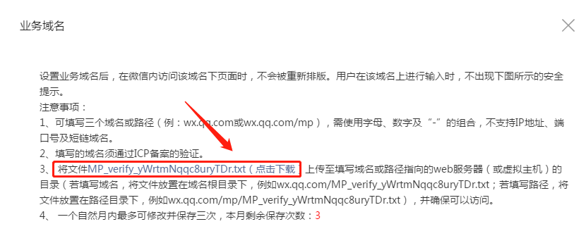 2)登陸進入微信公眾平臺——接口權(quán)限——網(wǎng)頁授權(quán)“修改”——業(yè)務(wù)域名“設(shè)置”--下載txt文檔