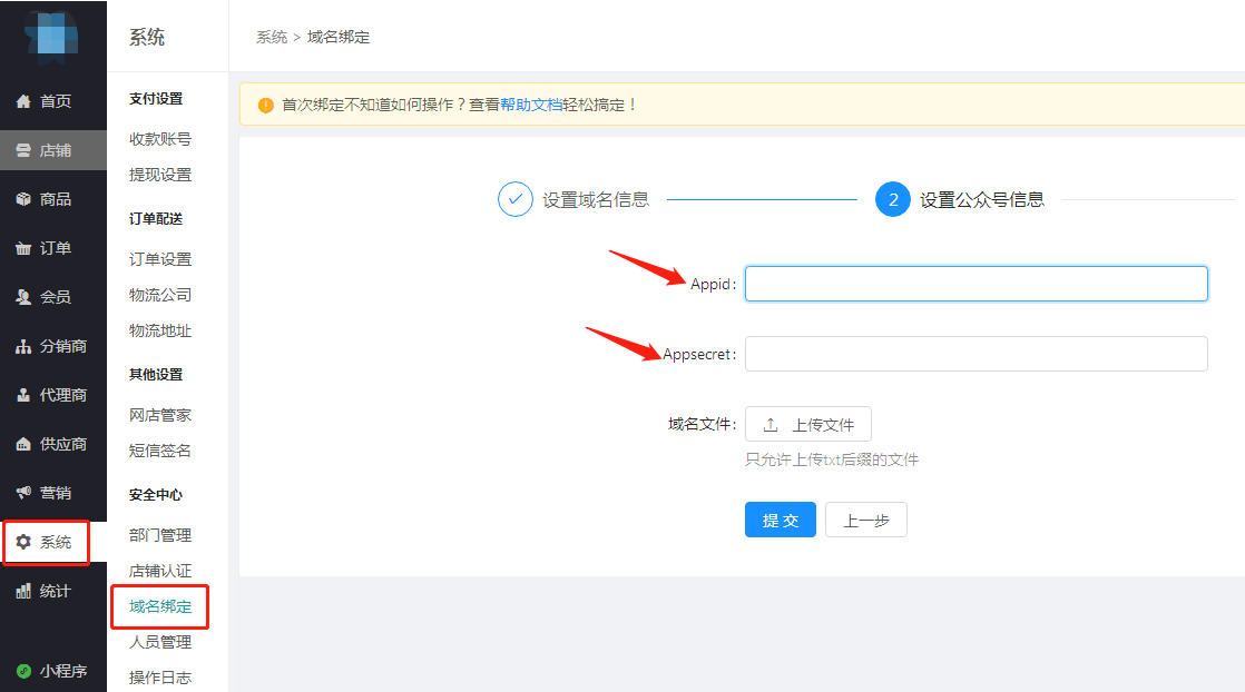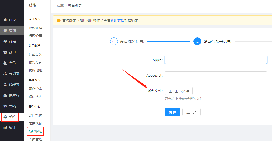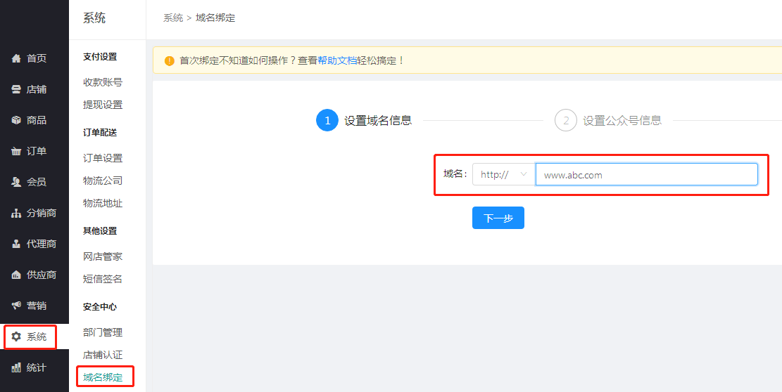 登陸安菲云后臺--系統(tǒng)--域名綁定--設(shè)置域名信息,填寫需要綁定的獨立域名,如域名是www.abc.com.則按照下圖所示填寫,填寫完點擊進入下一步;