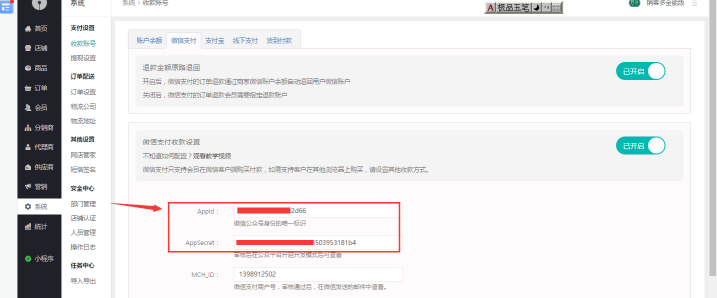 建議直接在安菲云后臺系統(tǒng)--微信支付中復(fù)制 AppID 以及AppSecret(前提是需要先配置好微信支付),在下圖所示位置復(fù)制即可