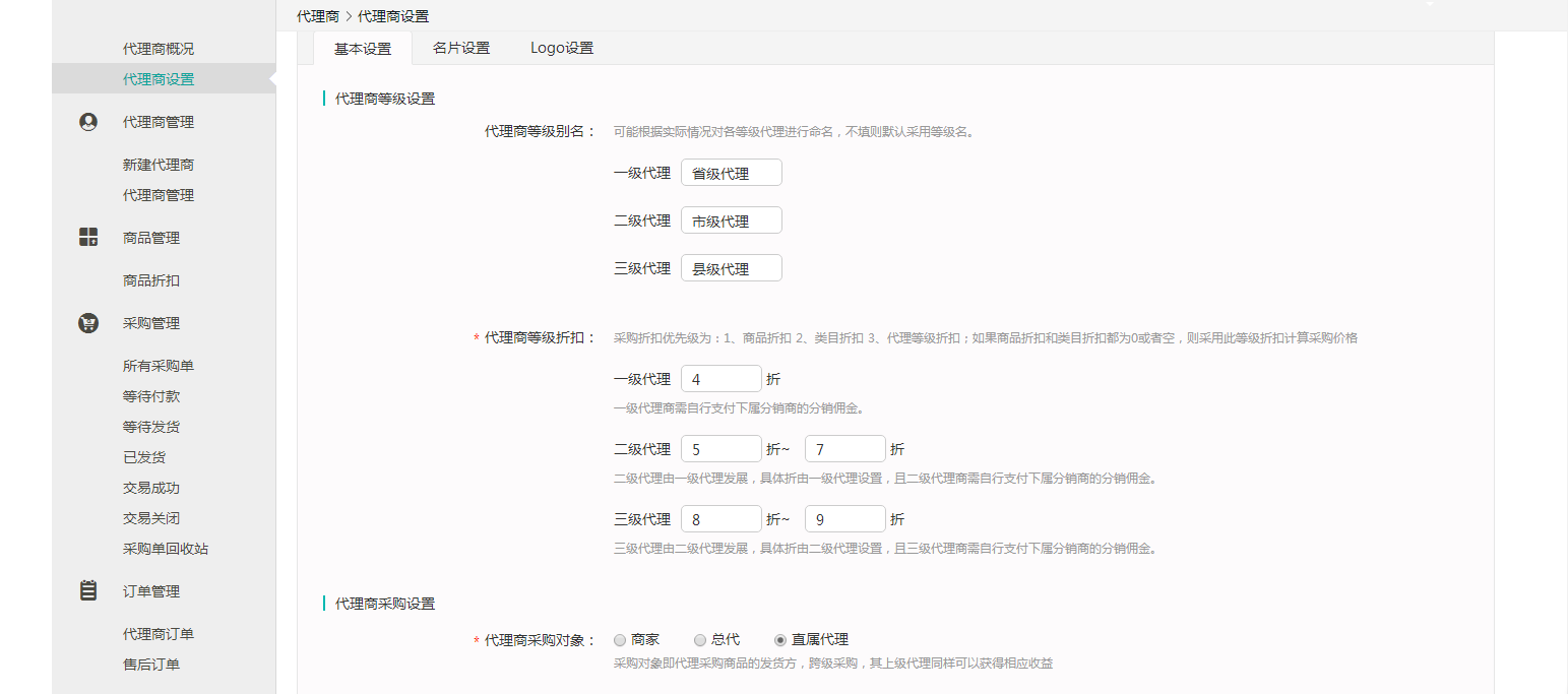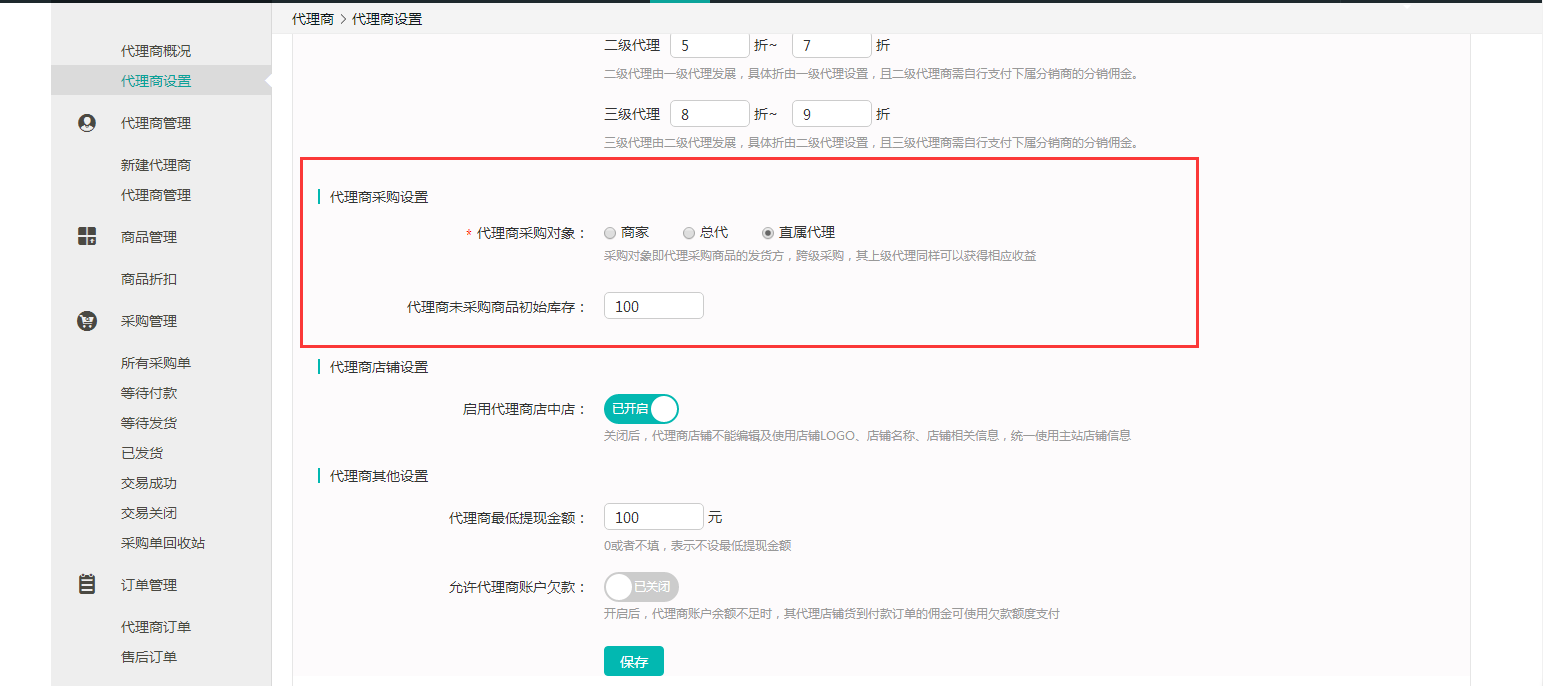 ② 代理商采購設(shè)置。采購對象就是代理商的發(fā)貨商,商家可以設(shè)置新代理商的直屬代理,總代理,或者自己對其發(fā)貨,同時(shí)商家需要設(shè)置代理商未采購的商品在其店鋪中顯示的庫存,商家可設(shè)置為0,強(qiáng)制要求代理商先采購,再銷售,也可以設(shè)置一個(gè)合理數(shù)值,代理商訂單由主站發(fā)貨,兩種方式均不會(huì)影響商品的正常銷售。