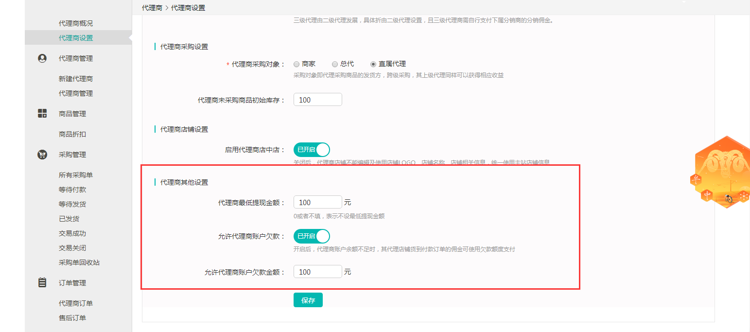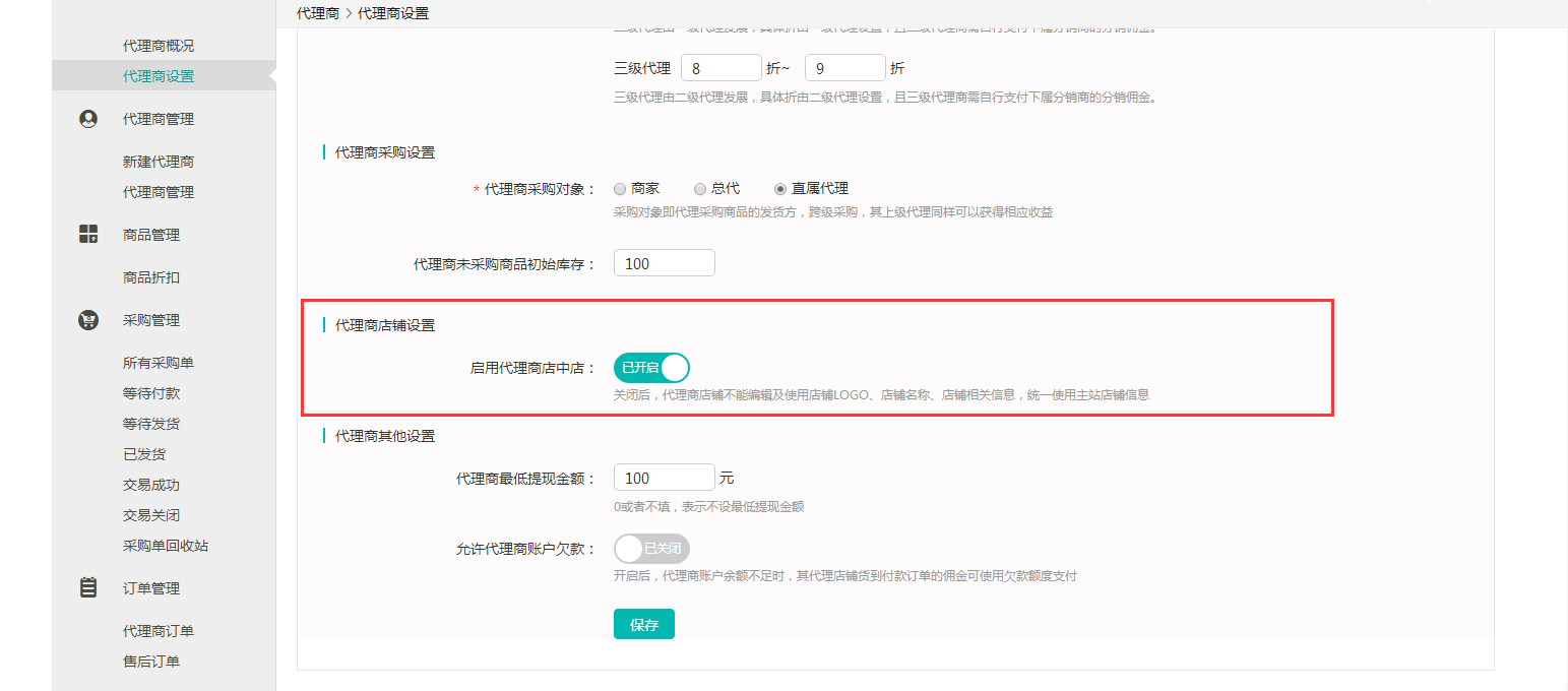 ④ 代理商其他設(shè)置。商家可設(shè)置代理商的最低提現(xiàn)金額以及代理商欠款功能,開啟了允許欠款功能的商家需要設(shè)置合理欠款額度。到這里整個(gè)代理商基本設(shè)置就算完成了。