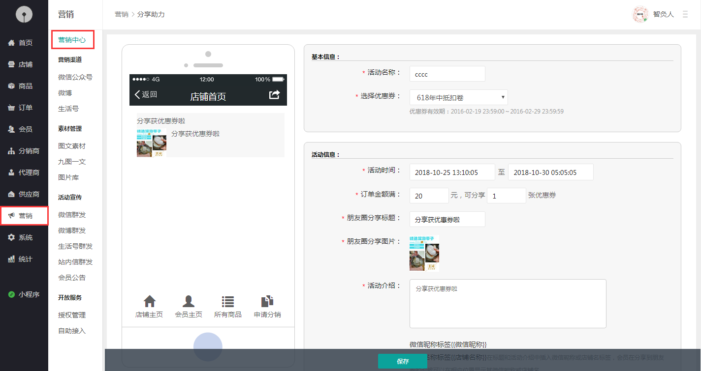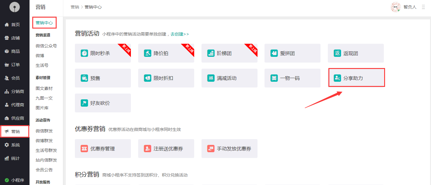 1.營(yíng)銷-->營(yíng)銷中心-->分享助力