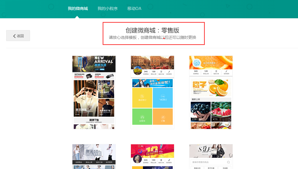 4、創(chuàng)建的微商城,選擇您所合適的頁(yè)面模板【一共16套】,如下圖所示: