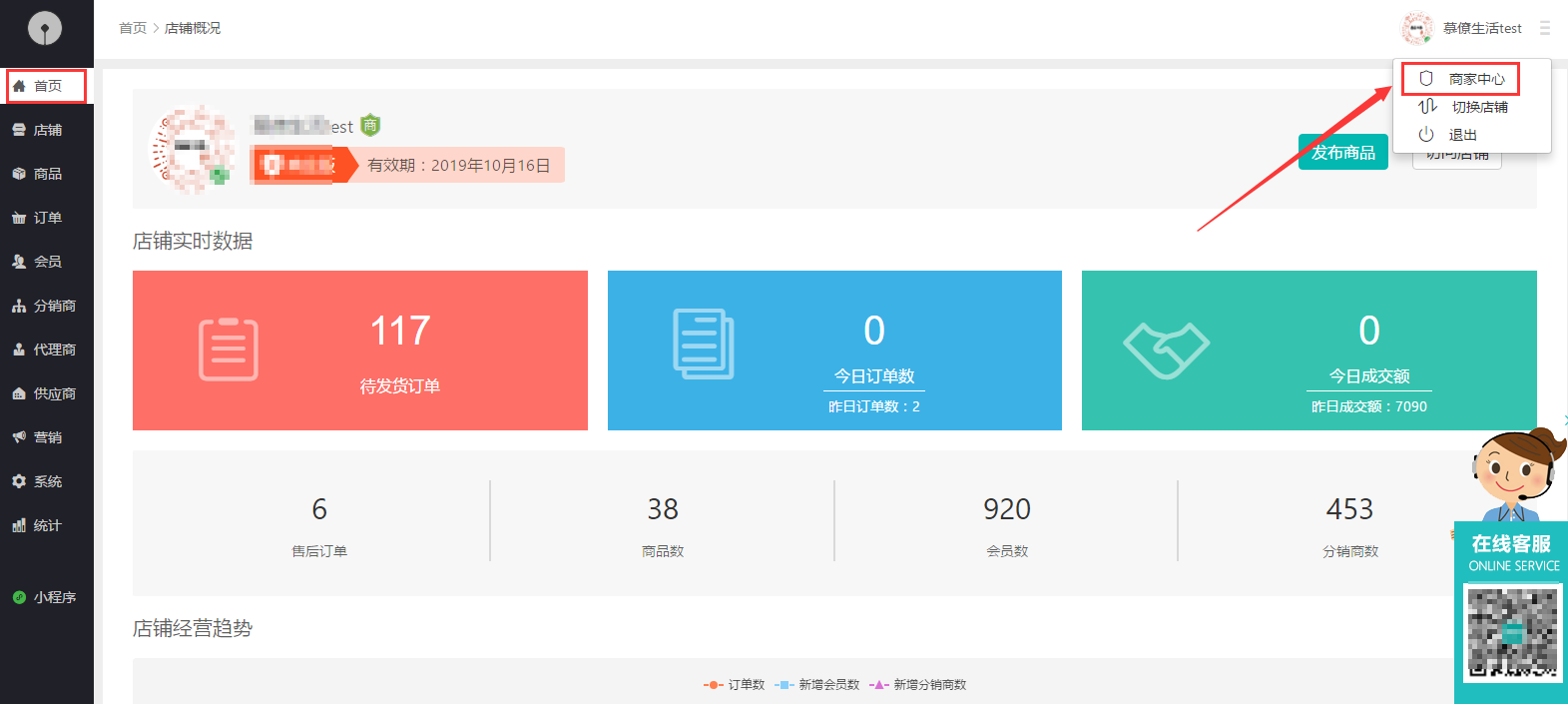 1、登錄商城后臺(tái),右上角點(diǎn)擊商家中心,如下圖所示: