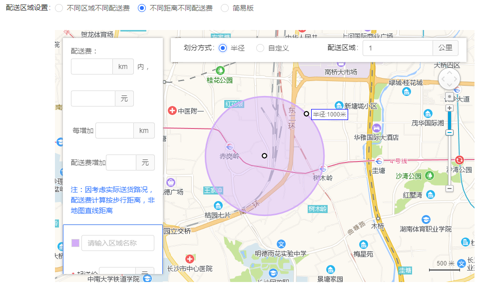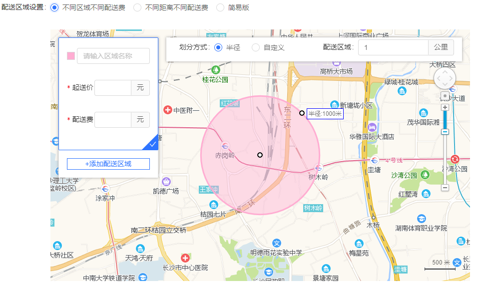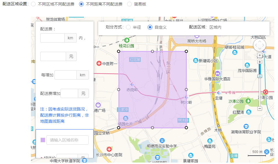 a.不同區(qū)域不同運費,有超區(qū)校驗,用戶下單時,收貨地址不在配送區(qū)域內(nèi)會提示,最多可添加10個配送區(qū)域,每個區(qū)域獨立設(shè)置起送價與配送費;區(qū)域劃分方式可選半徑或自定義:選擇半徑,會提供一個半徑為1km的圓形區(qū)域,可以拖動圓心改變位置,也可以通過拖動邊緣處得點,來改變區(qū)域大小;