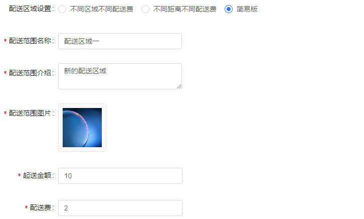 c.簡易版,沒有超區(qū)校驗,適合配送范圍內(nèi)地圖信息不完善的地區(qū);上傳配送范圍圖片,圖片建議地圖上畫區(qū)域并截圖,配送范圍的圖文內(nèi)容會在買家下單時,展示給買家,如果文字介紹和圖片都沒有,則買家下單時不會展示配送范圍信息。