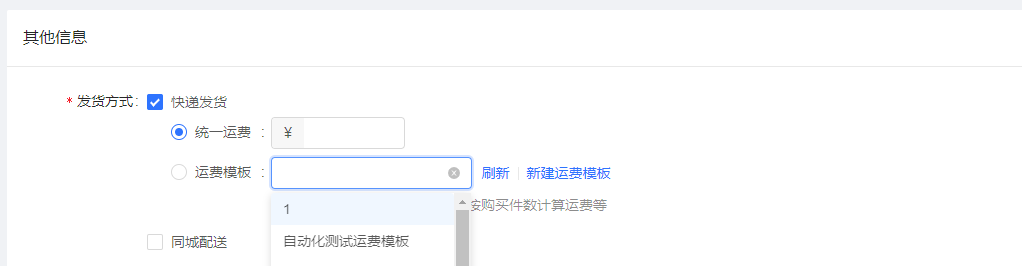 2. 在其他信息-發(fā)貨方式,選中快遞發(fā)貨后,點(diǎn)擊運(yùn)費(fèi)模板下拉列表,選擇您要設(shè)置的運(yùn)費(fèi)模板即可
