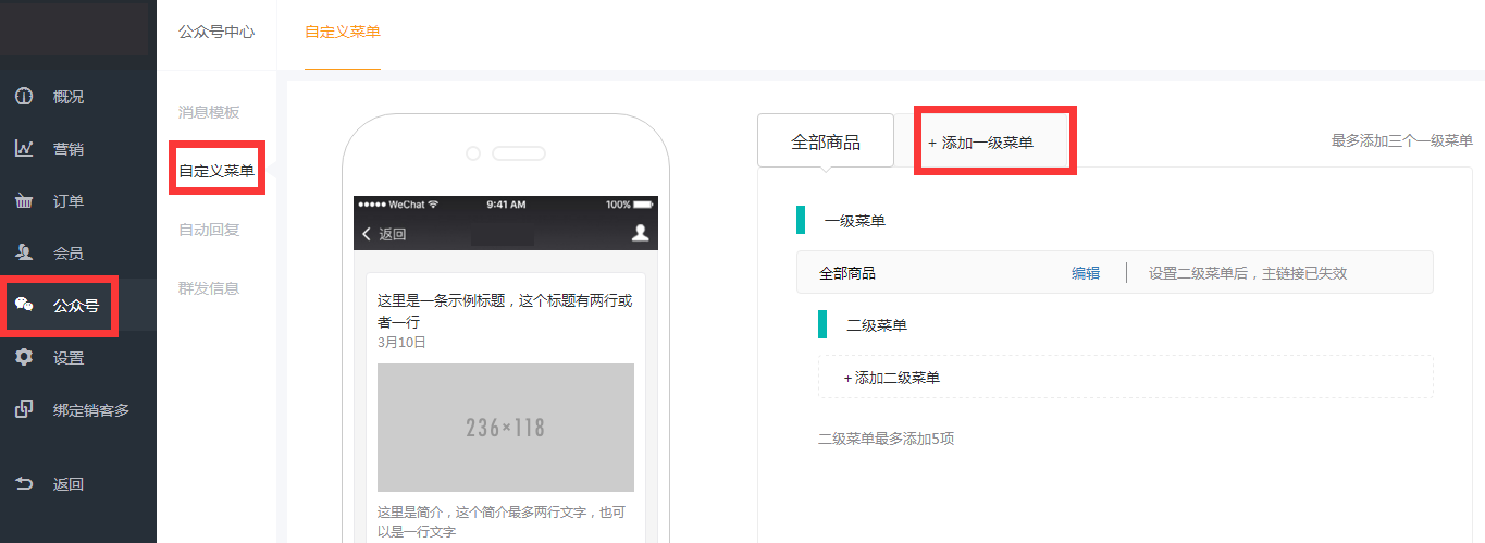 一級菜單:點擊編輯會彈出編輯菜單的內(nèi)容;一級菜單最多添加3個