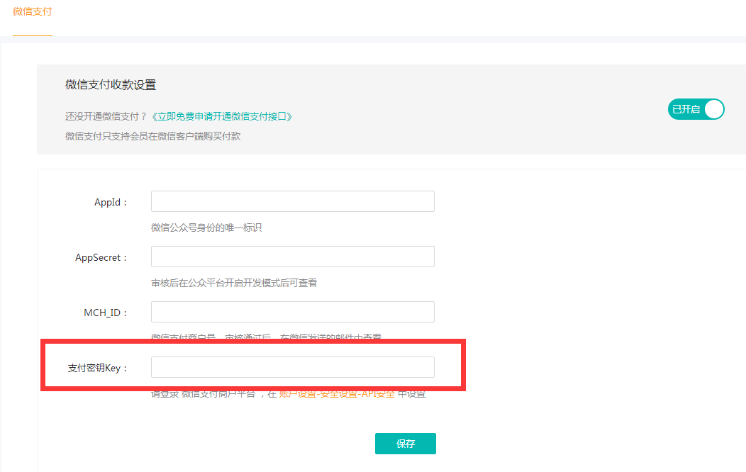 【支付密鑰Key】:將微信商戶平臺--API安全--設(shè)置的32位秘鑰,復(fù)制配置到云魔方后臺