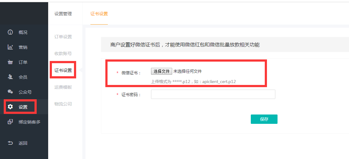 將下載的證書解壓后上傳apiclient_cert,將其證書上傳配置到云魔方后臺 ,證書密碼即商戶號。