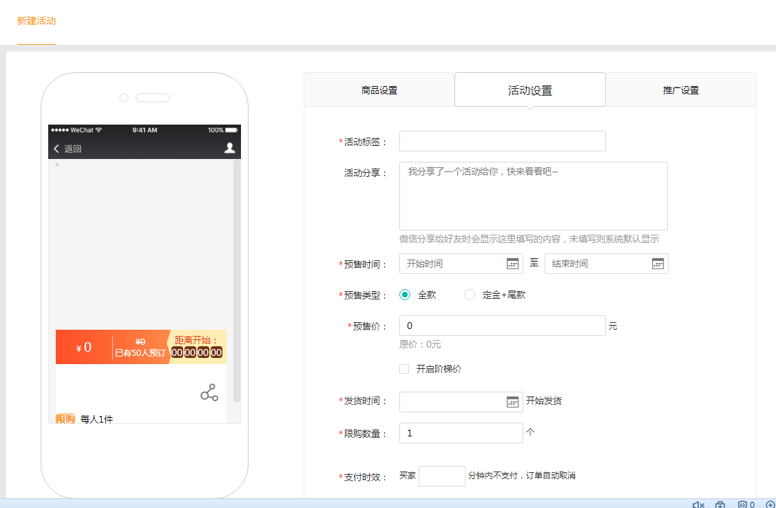 ?未開啟階梯價:指在預(yù)售期間內(nèi),買家需要全額支付商品的金額,當(dāng)預(yù)售時間結(jié)束后, 商家根據(jù)約定時間發(fā)貨;