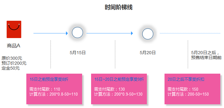 已開啟時間階梯價:指在預(yù)售期間內(nèi),買家先支付一定的預(yù)定金,當(dāng)預(yù)售結(jié)束后再按 約定時間支付尾款,尾款金額根據(jù)設(shè)置的階梯時間折扣價計算,可以設(shè)置多個階梯時間,每個時間折扣不同,如下圖所示,以商品A為例;