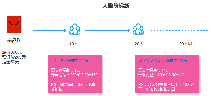 已開啟人數(shù)階梯價:指在預(yù)售期間內(nèi),買家先支付一定的預(yù)定金,當(dāng)預(yù)售結(jié)束后再按約定時間支付尾款,尾款金額根據(jù)設(shè)置的階梯滿足人數(shù)折扣價計算,可以按階梯設(shè)置滿足一定人數(shù)后享受不同折扣,如下圖所示,以商品B為例;