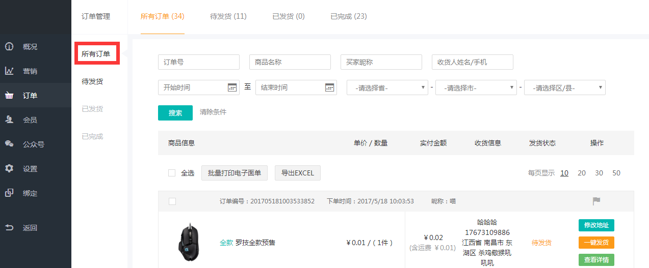 查詢:可根據(jù)訂單號、商品名稱、買家昵稱、收貨人姓名/手機(jī)、時間、地區(qū)查詢訂單;