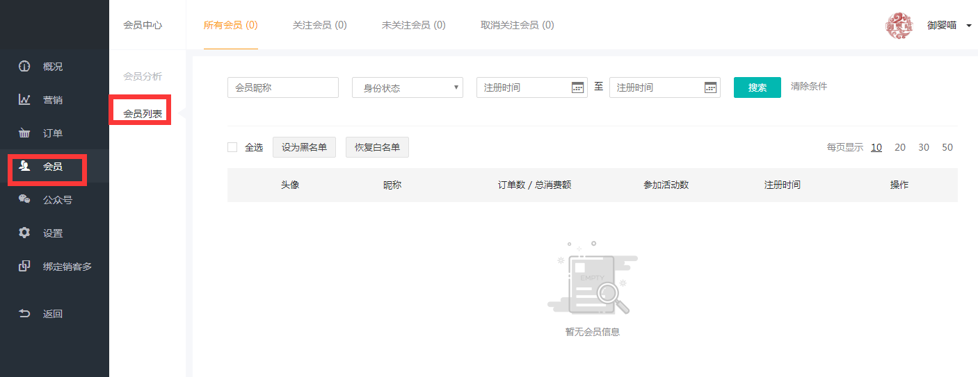 搜索:可根據(jù)會員的昵稱、身份狀態(tài)、注冊時間進(jìn)行搜索。