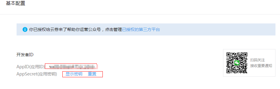 復(fù)制APPID和AppSecret配置至云魔方后臺