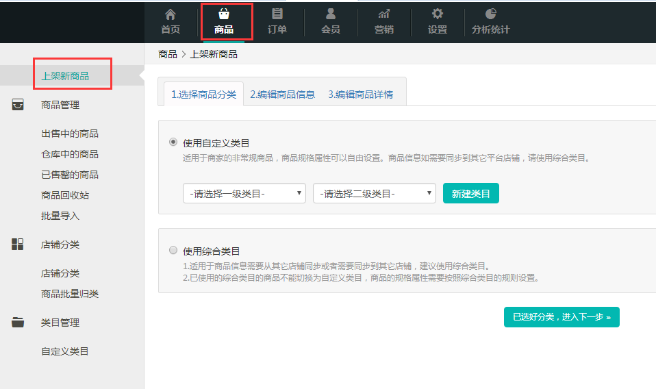 商品首先得選擇分類,選擇的類別下沒有子類別才能點擊下一步。(注:如果沒有找到所需的商品分類,可以選擇點擊新建類目新建二級類目,也可以提前在自定義菜單中統(tǒng)一添加)選好分類以后點擊進入下一步