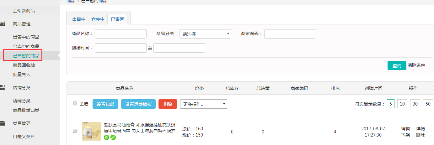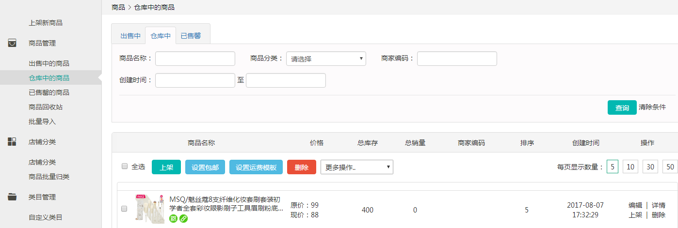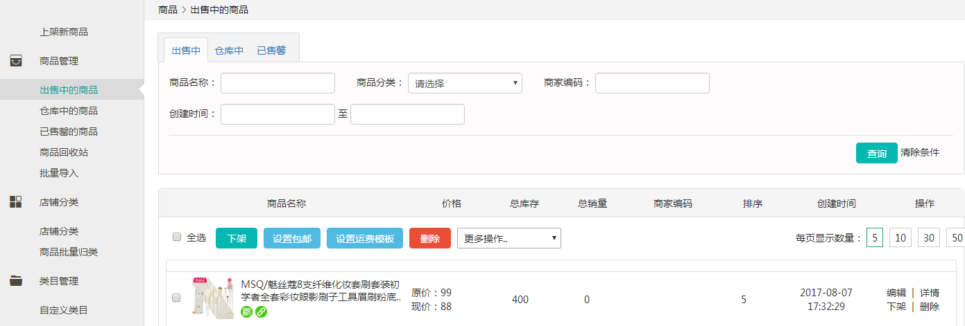 篩選條件:可根據(jù)商品名稱、商品分類、商家編碼、創(chuàng)建時間進行查詢;