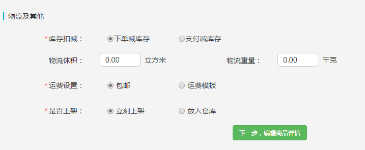 物流重量:商品的重量(后續(xù)運費模板設置按體積計算運費,需要用到物流體積)