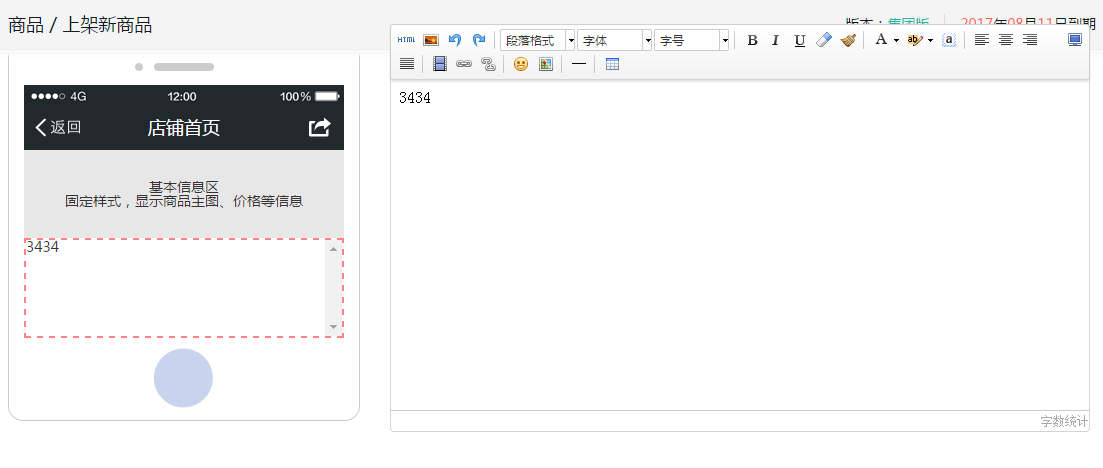 商品詳情效果預覽區(qū)域:左邊編輯區(qū)中添加了內(nèi)容,預覽區(qū)就會顯示前臺展示的效果。