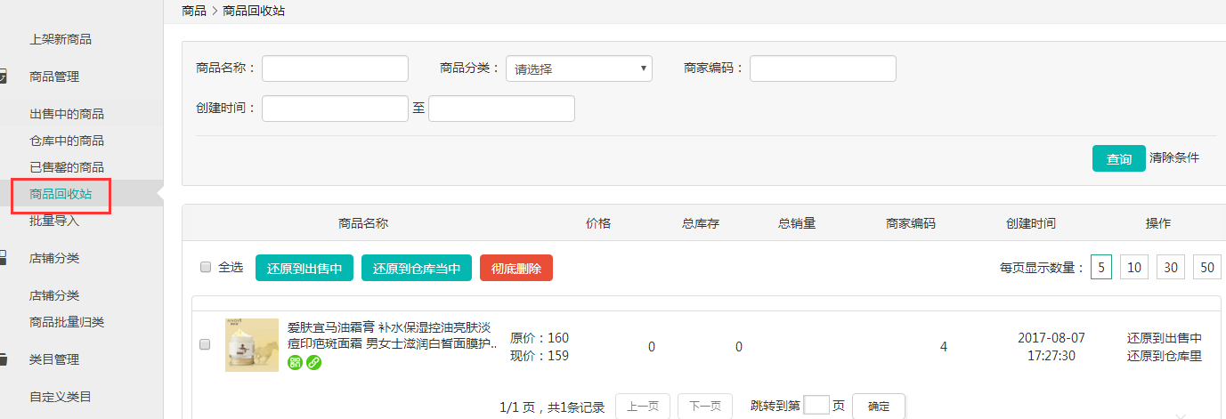 批量操作:可批量將商品徹底刪除、還原到出售中、還原到倉庫當中。