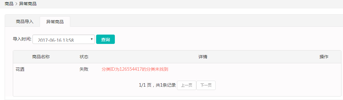 異常商品:顯示未導入成功的商品以及導入失敗的原因