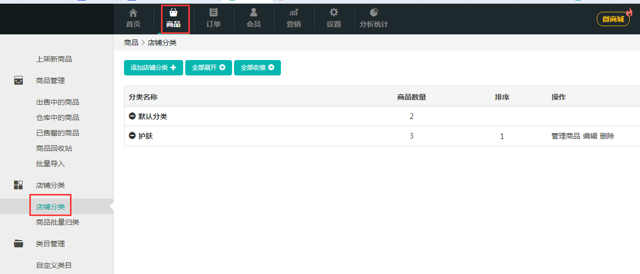 店鋪分類是將商城的商品分為幾大類,例如服裝的男裝女裝,上衣褲子等。分類是可以直接展示在商城前臺,直接通過商品分類搜索商品。