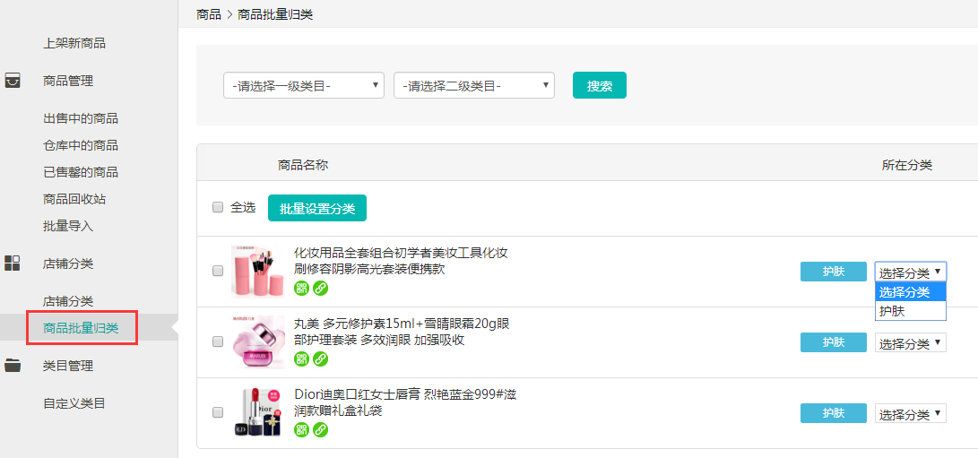 批量設置分類:選擇商品的分類以后批量調(diào)整分類