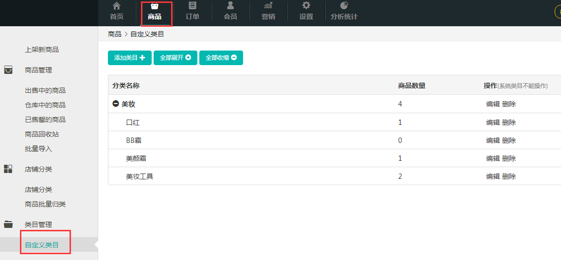 操作:可轉(zhuǎn)移分類下的商品、編輯和刪除分類
