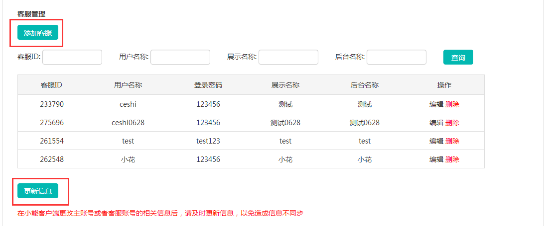 更新信息:在小能的客服軟件后臺添加客戶賬號點擊更新信息即可同步到安菲云后臺