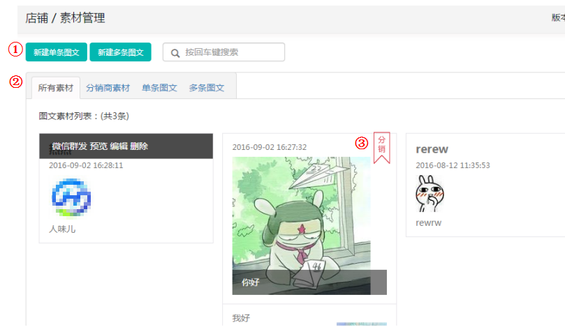 ② 所有素材:可針對(duì)已有的素材進(jìn)行編輯、預(yù)覽、刪除、微博群發(fā)、微信群發(fā);