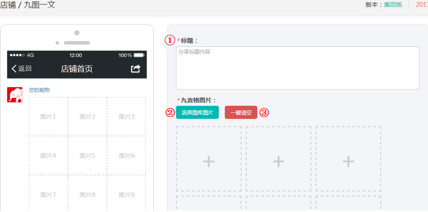 ② 選擇九宮格圖片:可以選擇圖庫圖片、商品圖片、一鍵清空等操作,也可以對(duì)單張圖片在圖片下面編輯、刪除;(上傳1-9張圖片,小于200k,jpg、gif、png、格式的圖片);