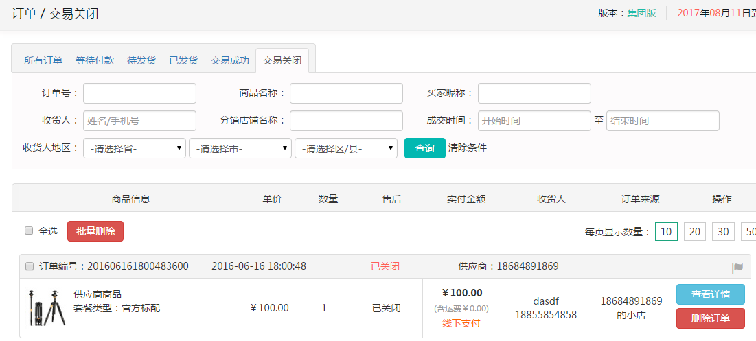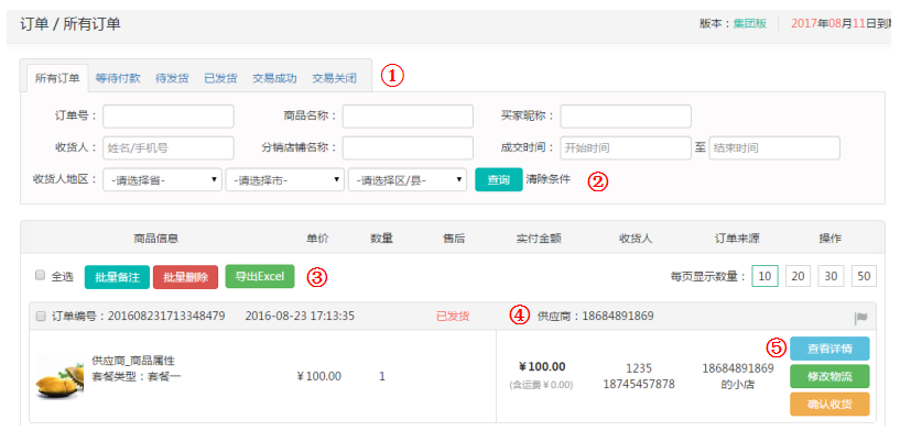 ④ 訂單來源:如果是供應(yīng)商的商品則顯示是哪個供應(yīng)商賬號,如果是主站商品則不顯示。