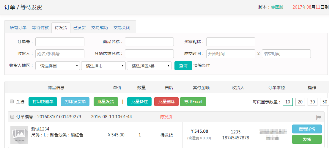 ⑤ 批量操作:可批量操作訂單打印快遞單、打印發(fā)貨單、批量備注、批量刪除等操作。