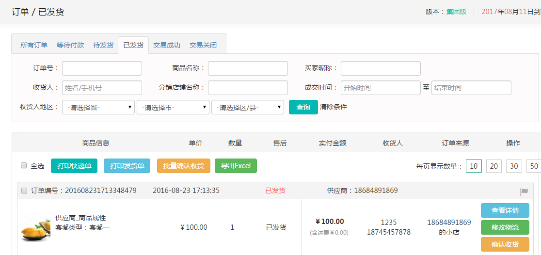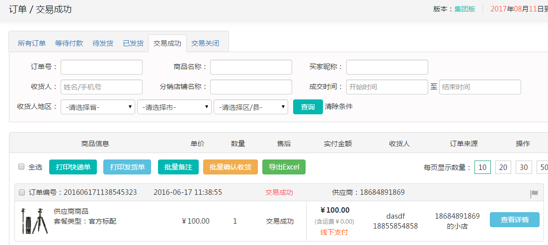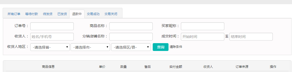 ② 查詢:可根據(jù)訂單號、成交時間、收貨人、收貨人地區(qū)、商品名稱、分銷店鋪名稱、買家昵稱查詢訂單;
