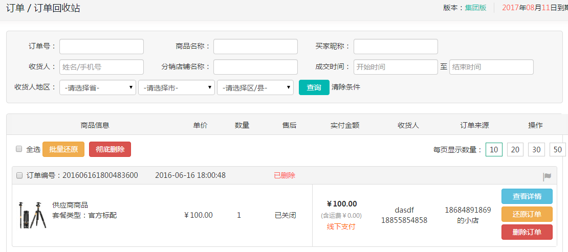 ④ 操作:可以對單個訂單操作還原和徹底刪除以及查看訂單詳情。