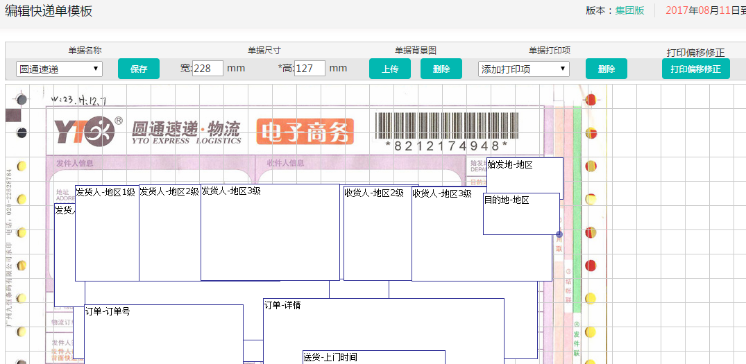先上傳一張快遞單據(jù)圖片,然后添加不同的要打印的項,點擊保存成功后,新單據(jù)即添加成功。