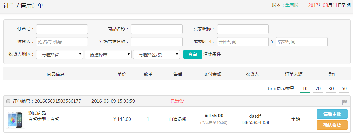 售后訂單主要是處理退換貨的訂單,在這里操作退換貨訂單的審核及確認操作。(注:退款退貨的金額需要線下操作進行打款,商城后臺只是對訂單的狀態(tài)進行修改。)