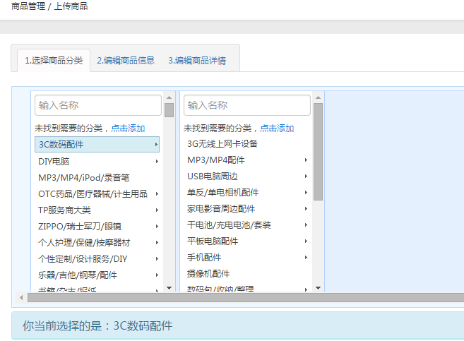 商品首先得選擇分類,選擇的類別下沒有子類別才能點擊下一步商品的信息的編輯。