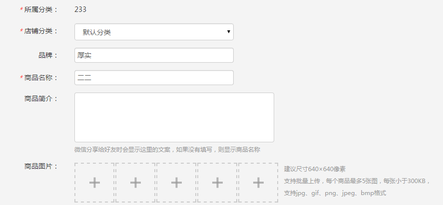 ⑤ 商品簡介:微信分享給好友時會顯示這里的文案,如果沒有填寫,則顯示商品名稱;