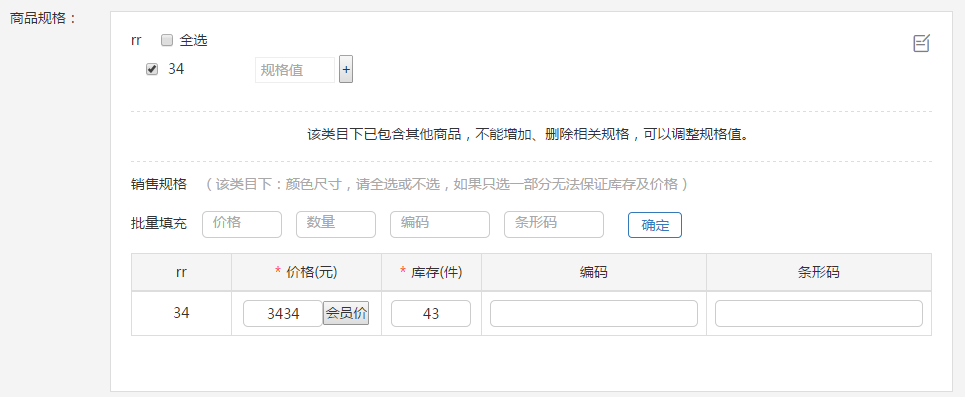 ⑧ 商品規(guī)格:如果是添加的自定義分類的話,在添加的自定義分類下可以添加規(guī)格值,添加好規(guī)格值之后填寫價格、庫存等。