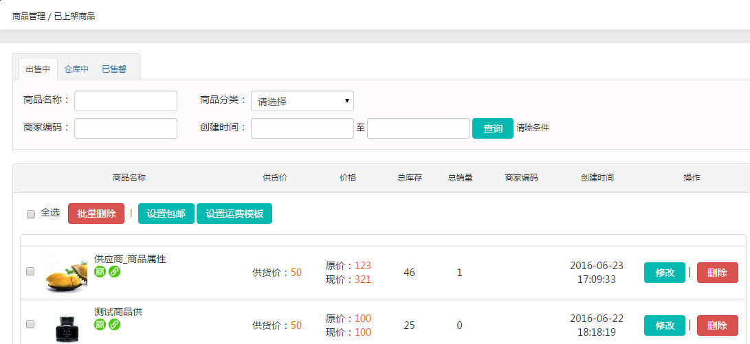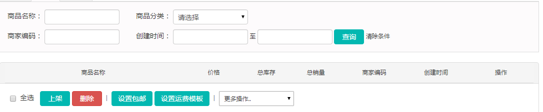 篩選條件:可根據(jù)商品名稱、商品分類、品牌、商家編碼、創(chuàng)建時間進行查詢;