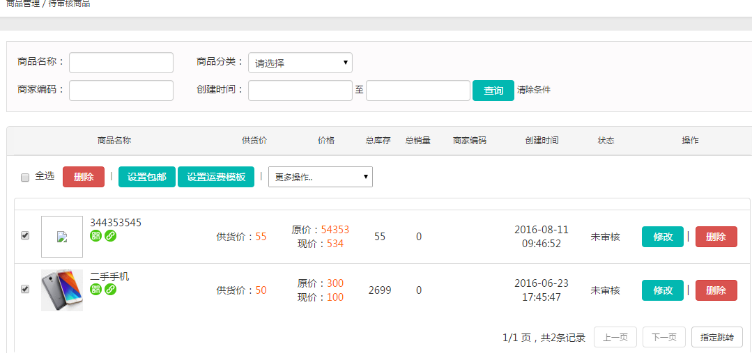 待審核商品顯示的供應商添加的商品,主站還未進行審核操作,或者是主站審核未通過的商品。可以在這里重新編輯商品或者操作刪除商品。