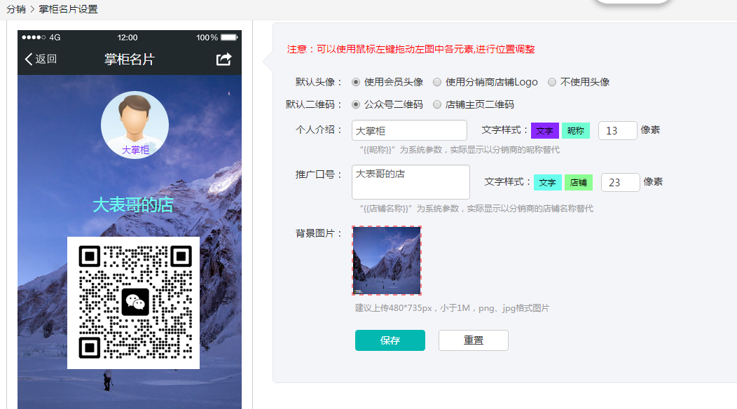 ② 個(gè)人介紹:添加店鋪介紹、分銷商介紹等信息,對(duì)文字樣式和大小進(jìn)行修改。