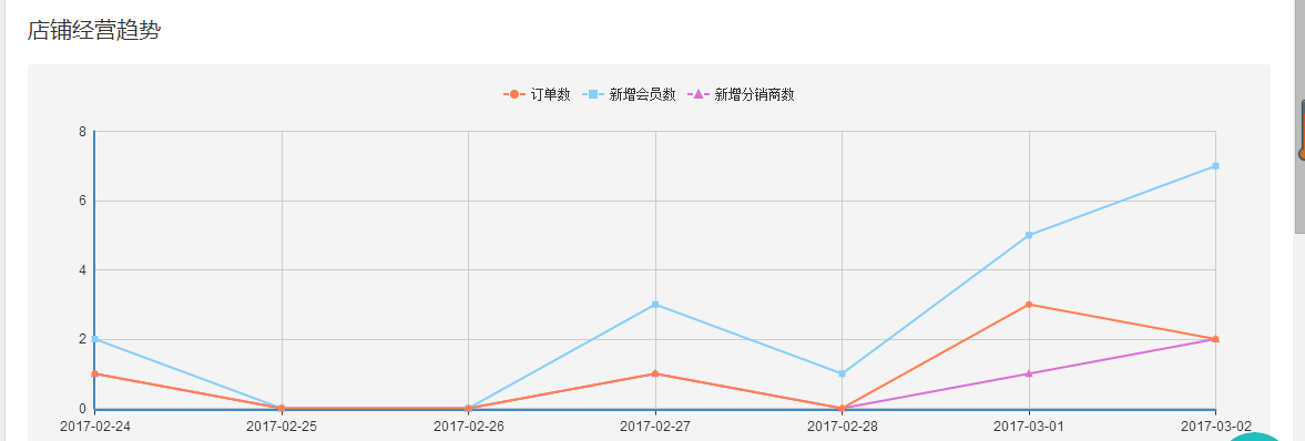 訂單數(shù)、新增分銷商數(shù)、新增會(huì)員數(shù)數(shù)據(jù)統(tǒng)計(jì)用折線圖展示: