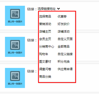 ①背景圖修改:最佳尺寸:640 x 200 像素。尺寸不匹配時,圖片將被壓縮或拉伸以鋪滿畫面。(這里的模板背景圖屬于輪播效果,除了需要選擇圖片外,還需要設(shè)置鏈接地址)